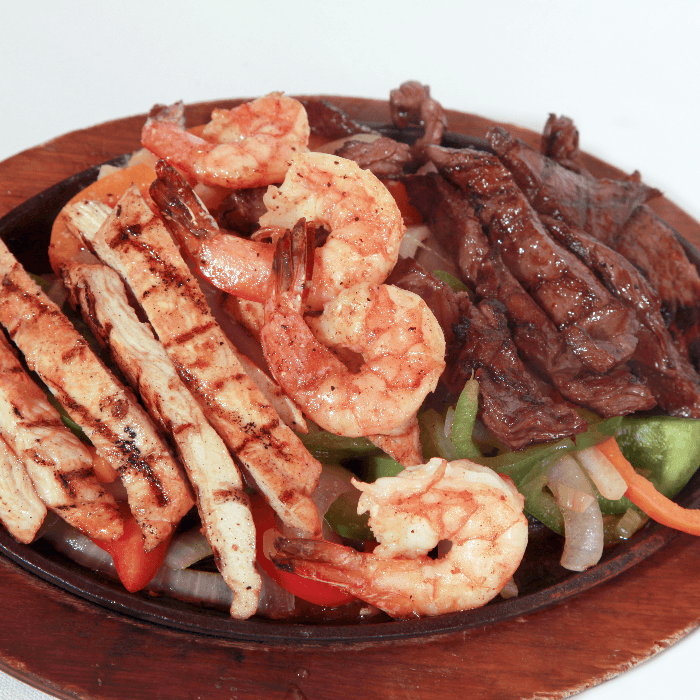 Grilled steak, chicken, and shrimp over sautéed bell peppers, onions, and warm tortillas on the side. Served sizzling in a hot skillet with rice, beans, lettuce, sour cream, tomatoes, shredded cheese, guacamole, and warm tortillas on the side.