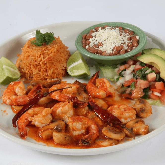 Shrimp sautéed in garlic butter with mushrooms, tossed in a spicy dibble sauce. Served with lettuce, tomatoes, rice and charro beans