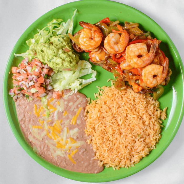 Butterflied jumbo shrimp coated and grilled in tangy adobo red sauce. Served with lettuce, pico de gallo, white rice, avocado slice, and charro beans